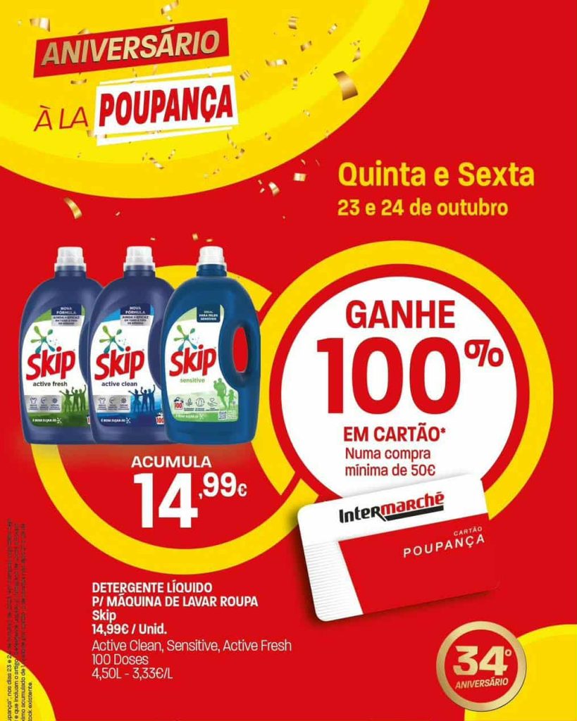 Valor a acumular no seu cartão “Poupança”, nos dias 23 e 24 de outubro de 2025, adquirindo o artigo ”detergente líquido p/ máquina de lavar roupa Skip, Active Clean, Sensitive, Active Fresh 100 doses”, numa compra de valor igual ou superior a 50€, num limite Máximo acumulado de 1 unidade por cartão, a descontar em data posterior assinalada .