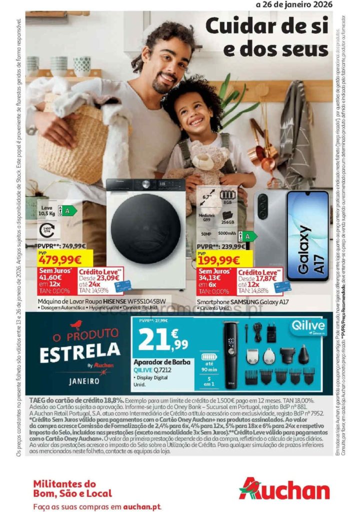A campanha mostra reduções equilibradas e distribuídas em várias áreas da loja. Folheto Auchan Box 14 a 26 de janeiro,