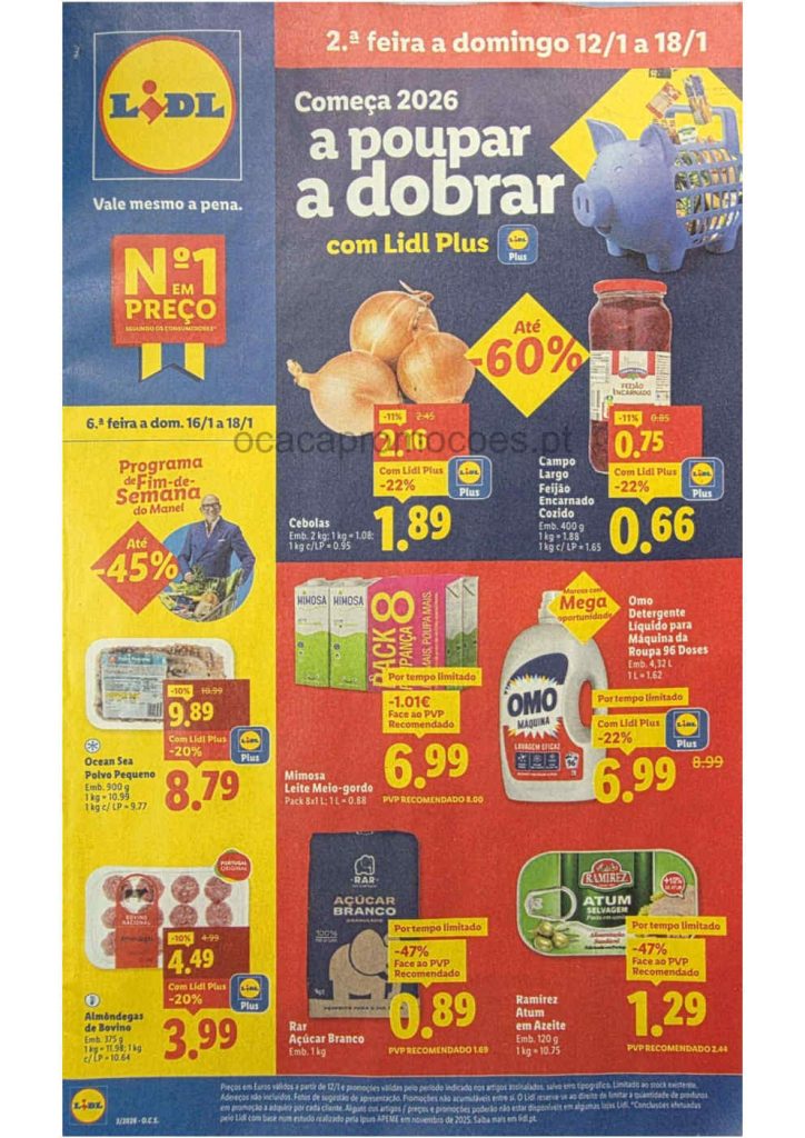 Este folheto traz reduções amplas em bens alimentares e produtos do lar. Folheto Lidl 12 a 18 de janeiro,