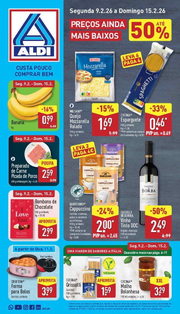 O conjunto de promoções inclui opções atrativas para compras grandes e pequenas. Folheto Aldi 9 a 15 de fevereiro,