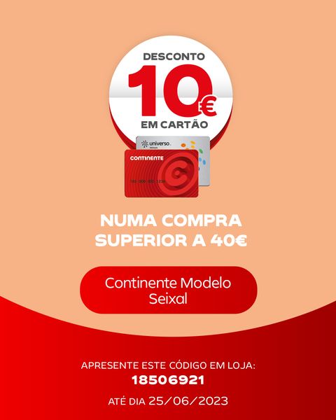 Aproveite já 10€ de desconto em Cartão Continente numa compra superior a 40€ no Continente Modelo. Apresente o código da imagem na loja para usufruir do desconto! OU conforme loja assinalada Aproveite já 5€ de desconto em Cartão Continente numa compra superior a 20€ no Continente Bom Dia. Apresente o código da imagem na loja para usufruir do desconto!