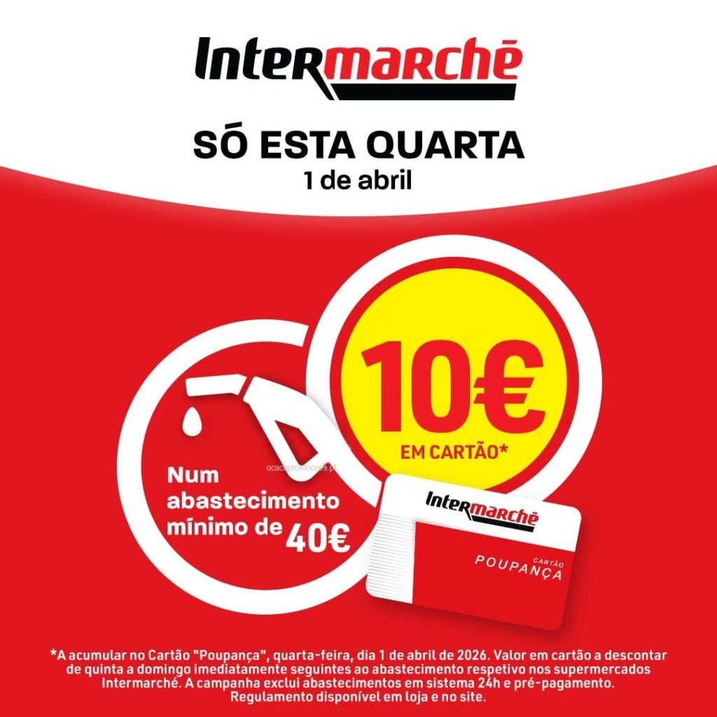 ⛽Válido num abastecimento mínimo de 40€ nos postos de abastecimento de combustível Intermarché aderentes e num limite máximo acumulado de 10€ por Cartão. Valor em cartão a descontar, de quinta a domingo, imediatamente seguintes ao abastecimento respetivo, nos supermercados Intermarché.