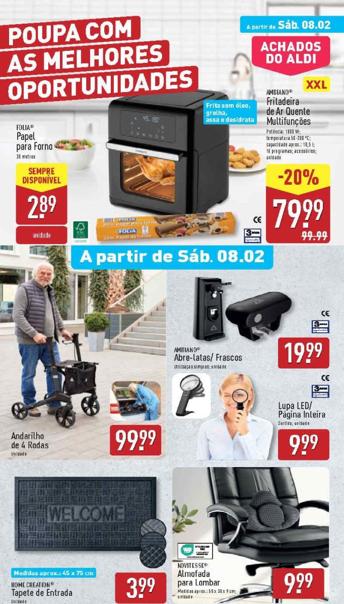 Novos achados ALDI.?Bazar desde fritadeira de ar quente multifunções AMBIANO com 20% desconto agora por 79,99€/unidade, andarilho de 4 rodas a 99,99€/cada, abre – latas / frascos AMBIANO a 19,99€/cada, lupa led / página inteira a 9,99€, tapete de entrada HOME CREATION a 3,99€/unidade, almofada para lombar NOVITESSE a 9,99€/unidade e mais. Aproveitem e façam a lista bazar!? Todo o folheto abaixo! ?