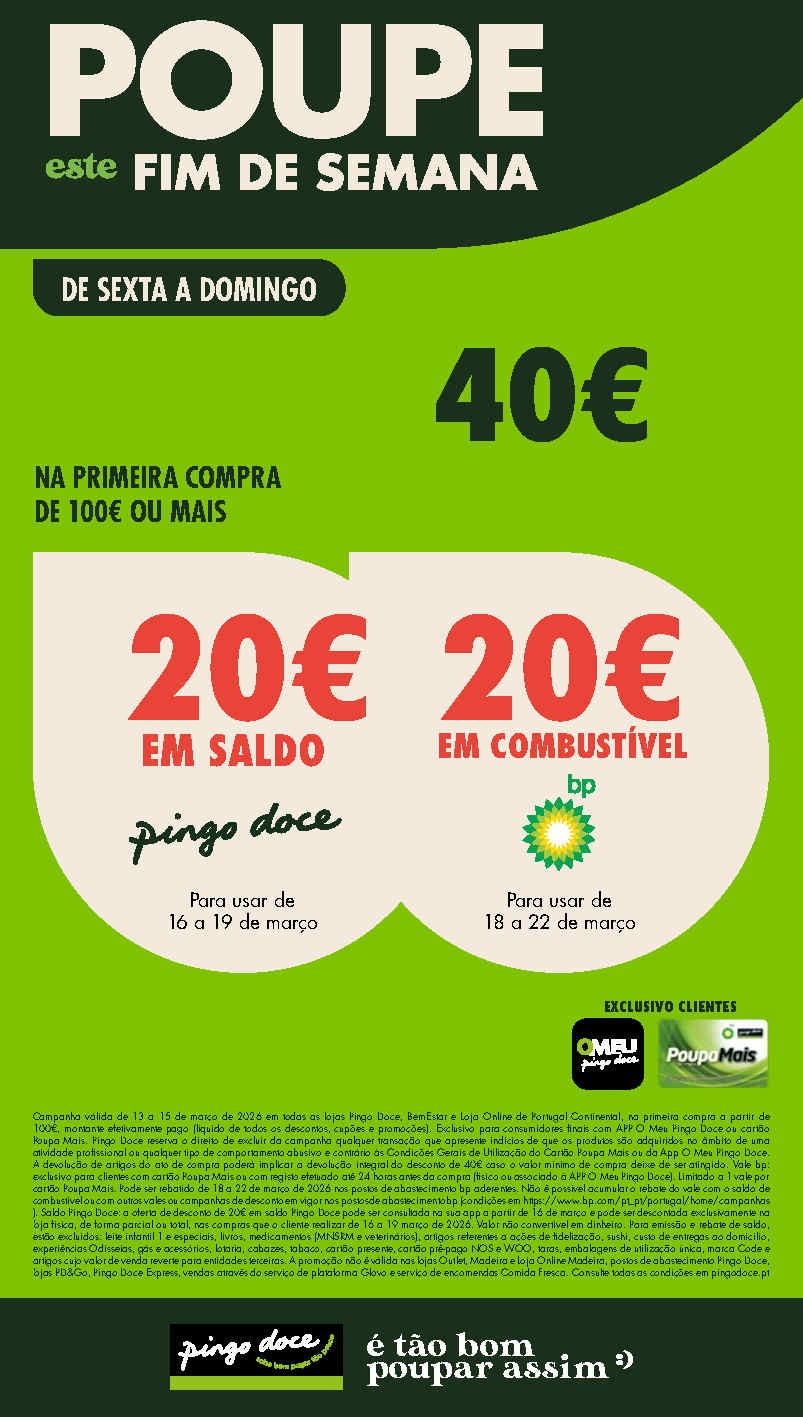 Para acumular os 20€ +20€ com os descontos em toda a loja, Aproveite e Acumule com o folheto semanal e de fim de semana. Volta a oferta 20 € + 20€. Multiplicam assim as oportunidades em supermercado e combustível ( que bem caro está) . A Oferta de 40€ na primeira compra de 100€ ou … Continue a ler Antevisão Folheto Pingo Doce Fim de Semana 13 a 16 de março