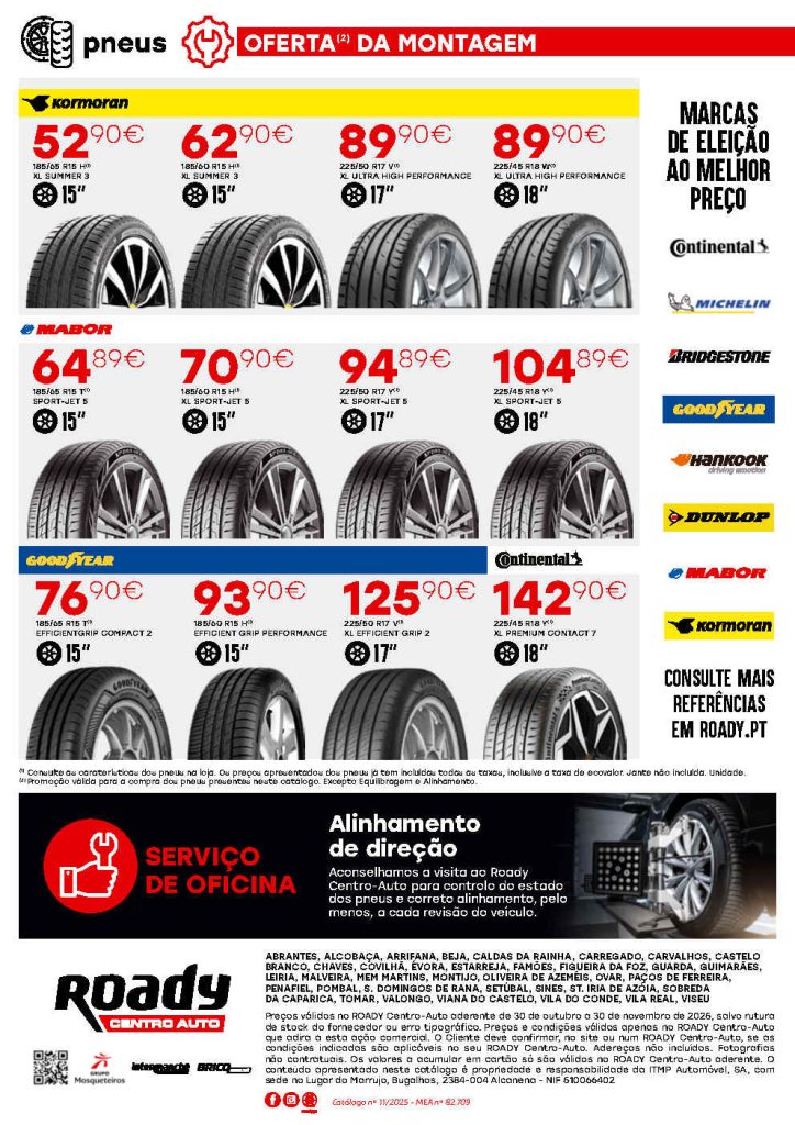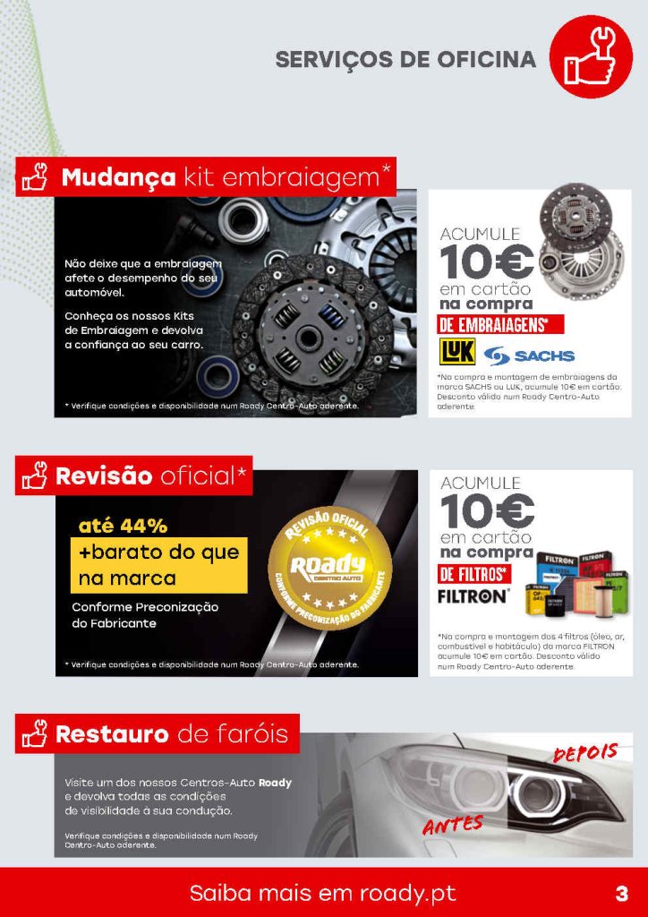 Os descontos e promoções em reparação, manutenção e cuidados mobilidade nos centro auto ROADY. Usem o cartão ROADY e a cada 250€ recebem 10€ desconto. Boas viagens para todos vão e venham sempre em segurança. Todas as ofertas sempre aqui no site. Consultem os Folhetos. A Antevisão Folheto!🛒