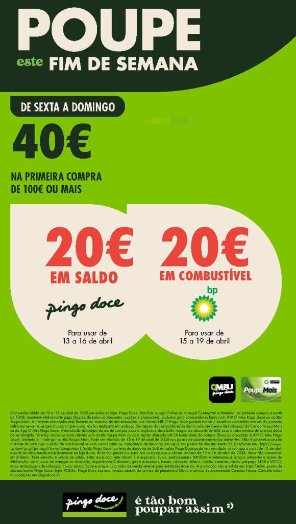 Volta por 2 dias a oferta 20 € + 20€. Multiplicam assim as oportunidades em supermercado e combustível. A  Oferta de 40€ na primeira compra de 100€ ou mais. Assim 20€ em compras🛒 e 20€ em vale combustível BP ⛽para usar em datas posteriores. Consultem os Folhetos. A Antevisão!🎯