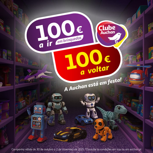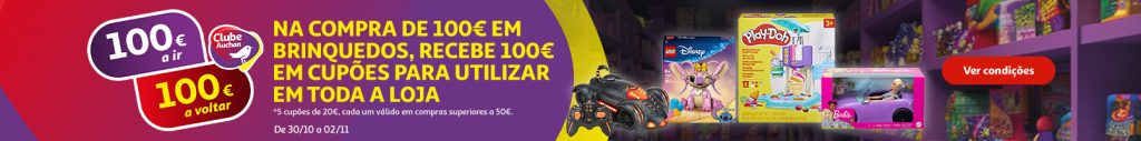 Campanha: Ao fazer uma compra de 100€ em Brinquedos de 30 de outubro a 02 de novembro de 2025 recebe 100€ em cupões para utilizar em toda a loja.