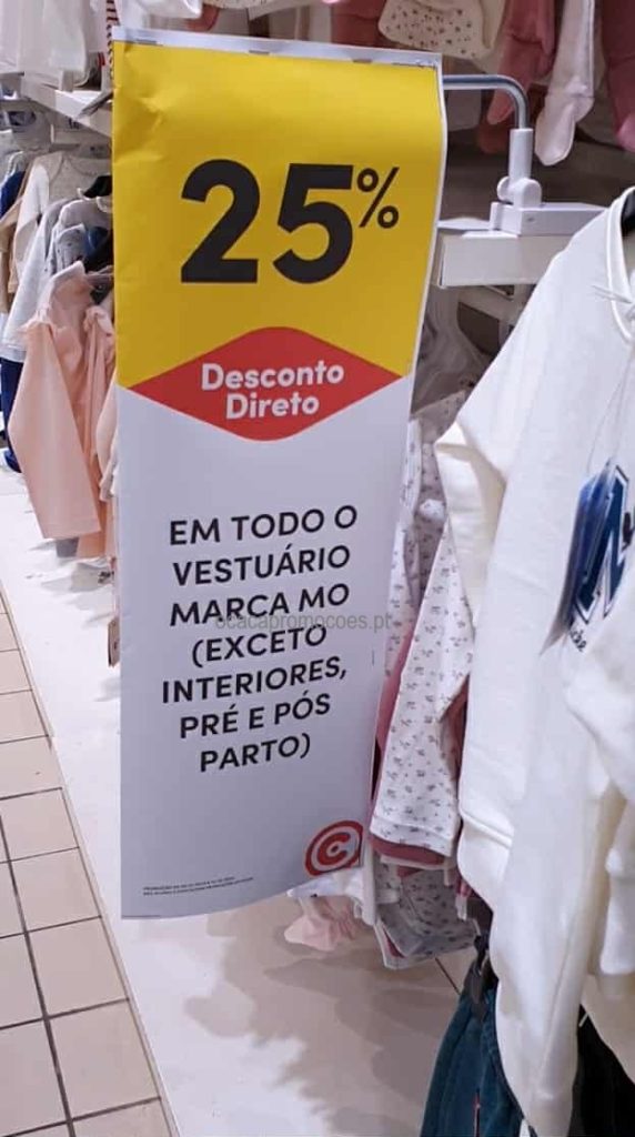 Aproveite 25% desconto em todo o vestuário marca MO ( exceto interiores, pré e pós parto ). Pode acumular com cupões de 5€ ou 10% que tenha nas lojas Continente.