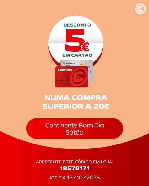 Aproveite ( Nas 7 lojas assinaladas nas imagens) os 5,00 € de desconto em Cartão Continente numa compra superior a 20€ no Continente Bom Dia Largo da Graça, Continente Bom Dia Satão, Continente Bom Dia Canas de Senhorim, Continente Bom Dia Odivelas D. Dinis, Continente Bom Camarate, Continente Bom Dia Marinha Grande, os 10,00 € de desconto em Cartão Continente numa compra superior a 40€ no Continente Modelo S. Vicente. Apresente o código da imagem na loja para usufruir do desconto.