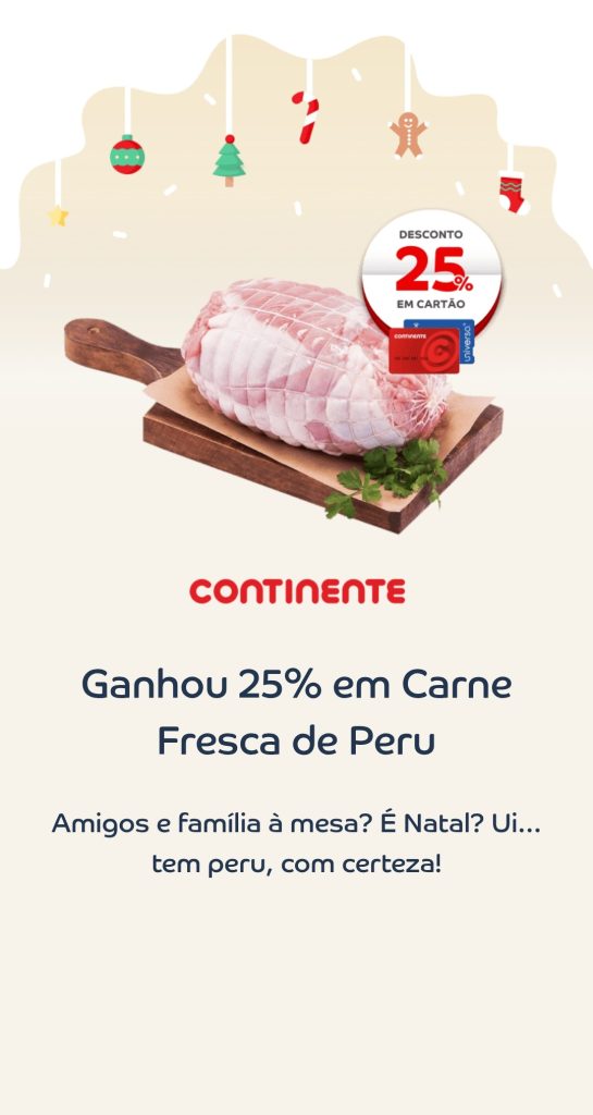 Aproveite já para guardar o cupão de hoje 20 de dezembro📅. São 25% desconto cartão carne de peru! As acumulações, avistamentos, comparações, dicas, sugestões de poupança, amostras, vales grátis e muitas surpresas atualizadas no site O Caça Promoções. Consultem os Folhetos.
