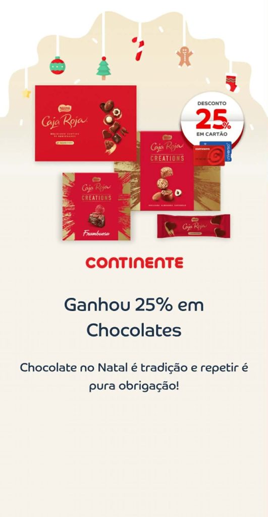 Aproveite já para guardar o cupão de hoje 8 de dezembro🎄. São 25% desconto cartão em Chocolates! As acumulações, avistamentos, comparações, dicas, sugestões de poupança, amostras, vales grátis e muitas surpresas atualizadas no site O Caça Promoções. Consultem os Folhetos.