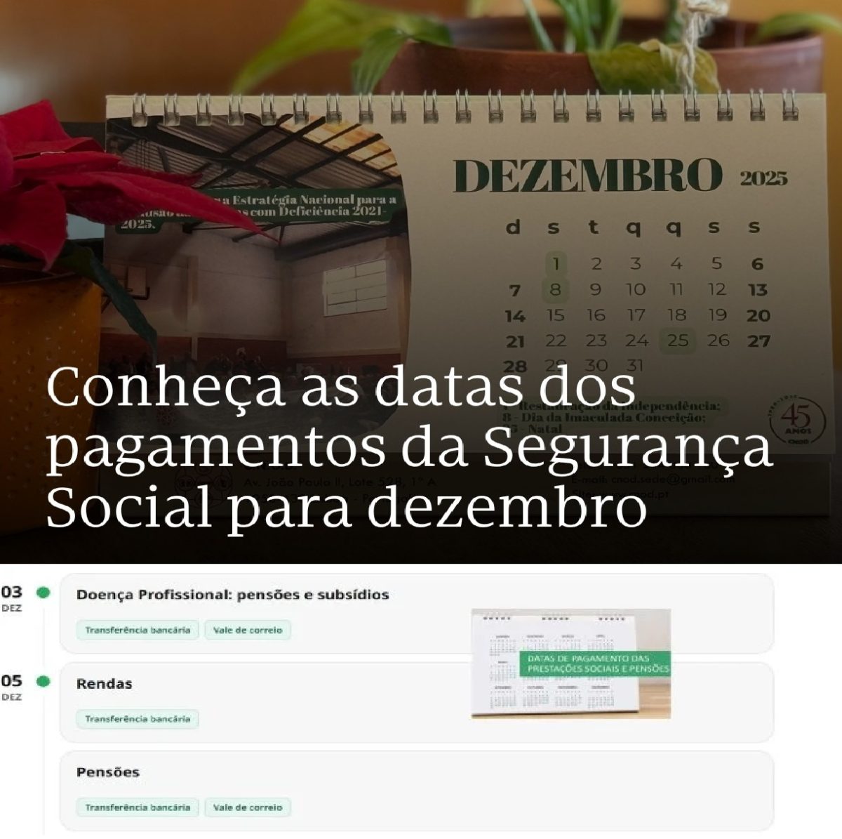 Estes são os dias de pagamento antecipados da Segurança Social em dezembro 2025, A informação mais atualizada em pensões, subsídios, prestações sociais pagos através de transferência bancária ou vale de correio.📅 Os respetivos pagamentos serão nas datas abaixo mencionadas. Consulte ainda mais artigos Segurança Social aqui no site O Caça Promoções.⏰ Pagamentos Doença profissional – Pensões … Continue a ler Datas de Pagamento Segurança Social: Antecipação Subsídios e Pensões em dezembro