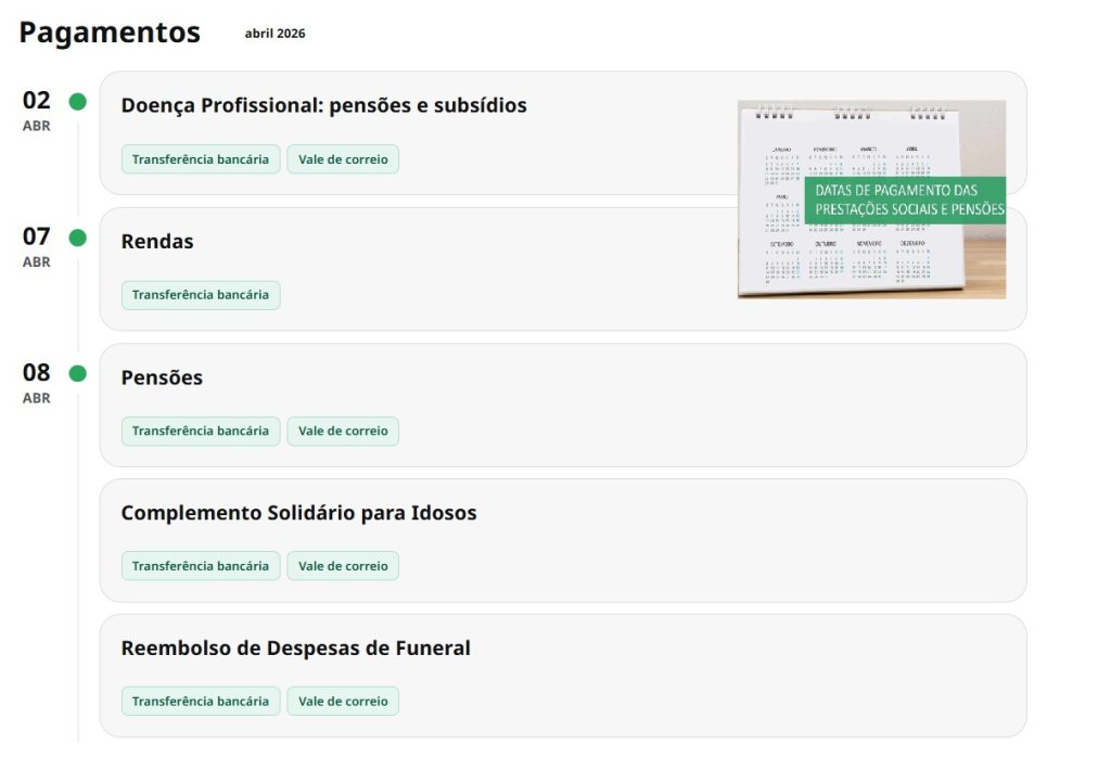 Todos os pagamentos de 1 a 30 de abril 2026 Segurança Social. 📅A informação em pensões, subsídios, prestações sociais e mais a ser pagos através de transferência bancária ou vale de correio.