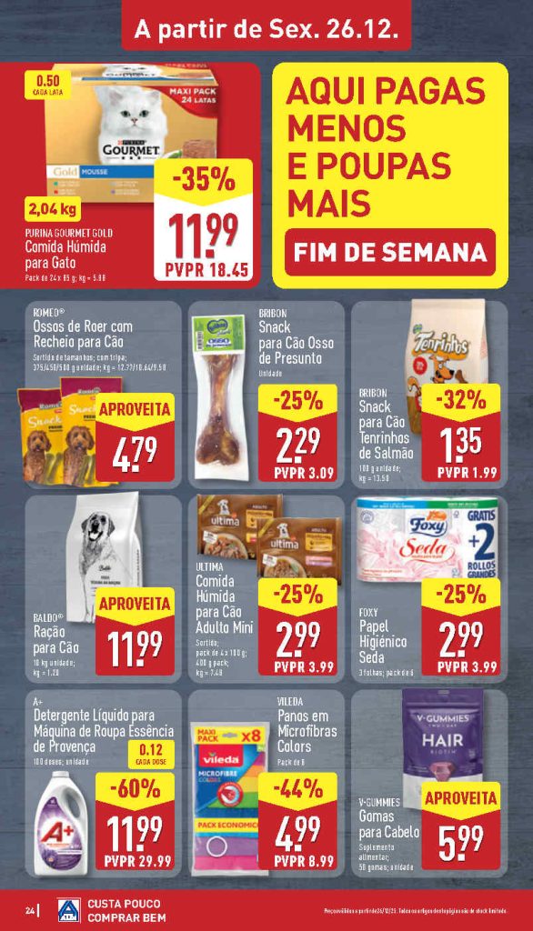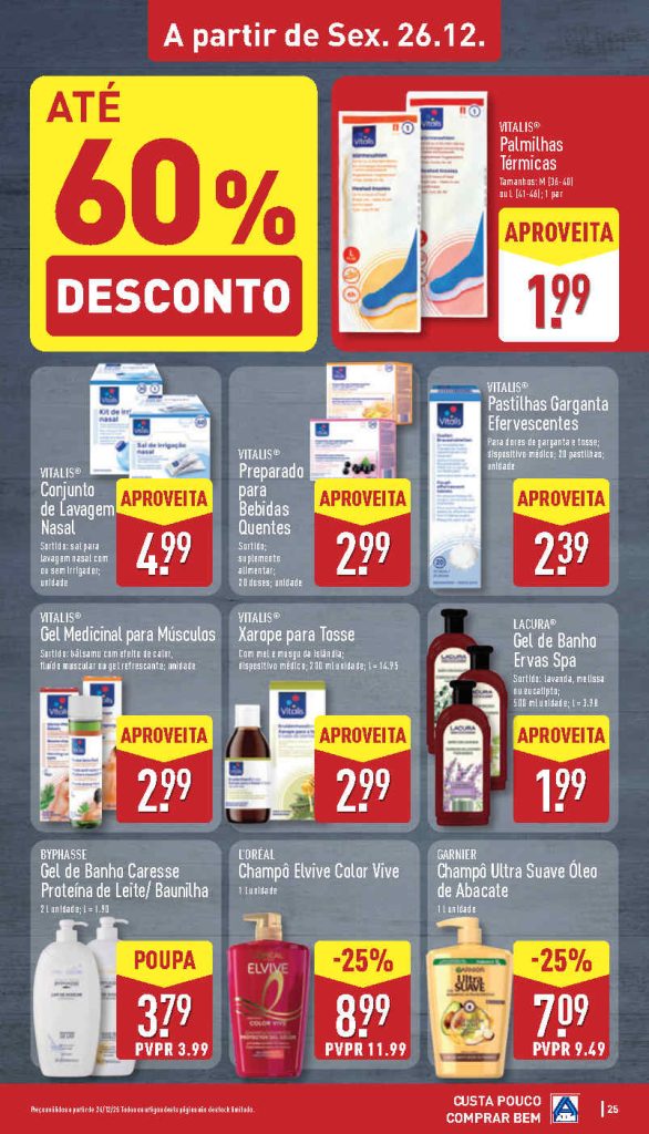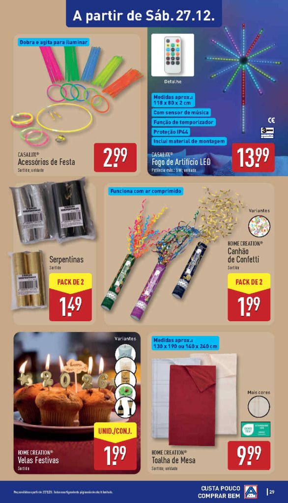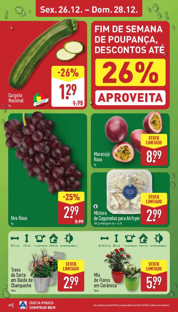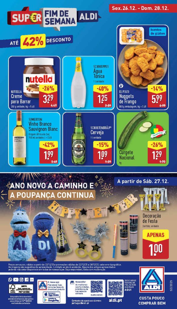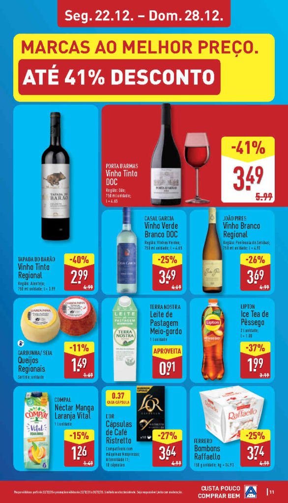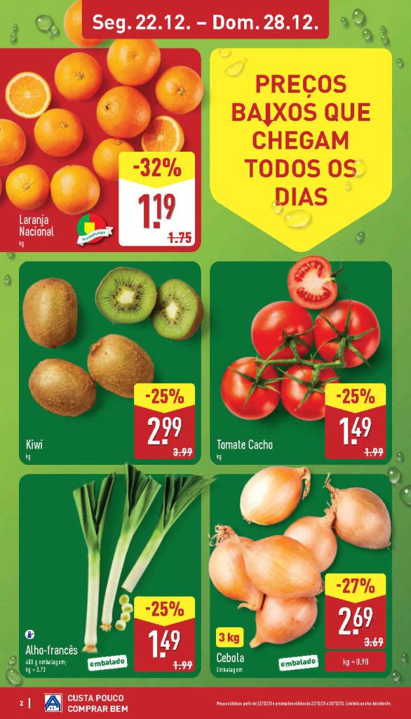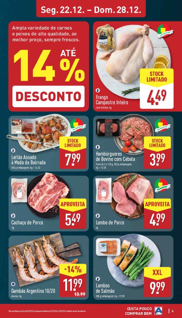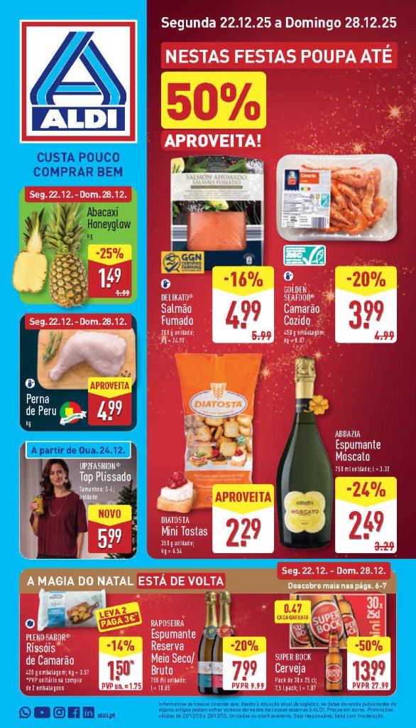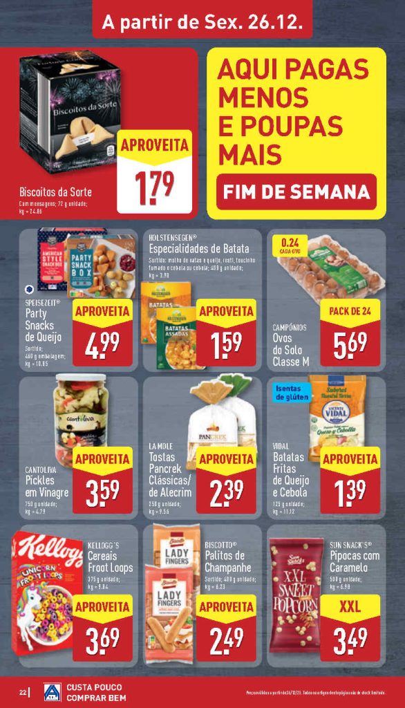 O conjunto de promoções inclui opções atrativas para compras grandes e pequenas. Folheto Aldi 22 a 28 de dezembro,
