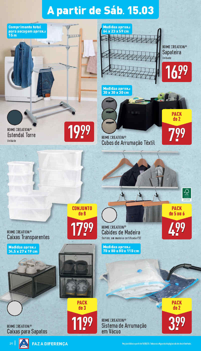Folheto ALDI Bazar Promoções 15 a 18 de março. Todas as promoções bazar nas várias categorias. ? Destaques para poupar desde estendal torre HOME CREATION a 19,99€/cada, sapateira HOME CREATION a 16,99€/unidade, cubos de arrumação têxtil HOME CREATION a 7,99€/ pack 2 unidades, caixas transparentes HOME CREATION conjunto de 8 a 17,99€, caixas para sapatos … Continue a ler Folheto ALDI Bazar Promoções 15 a 18 de março