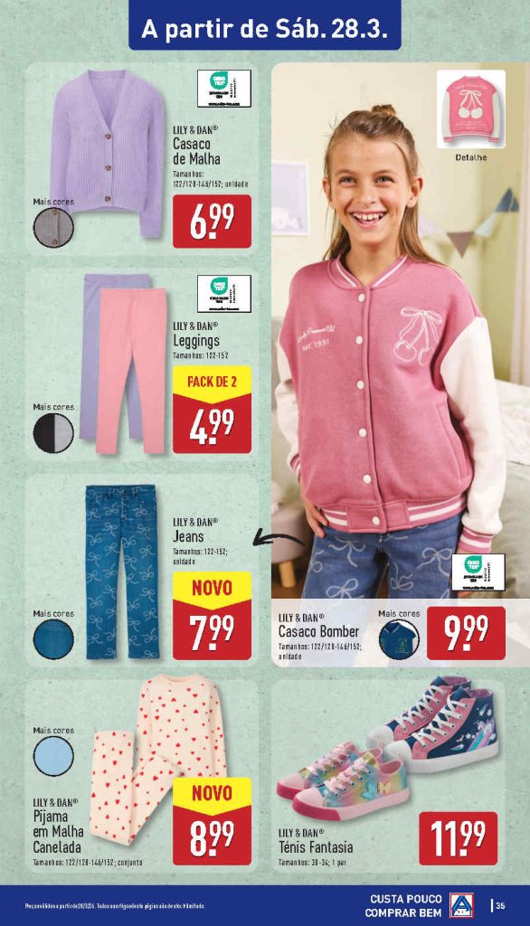 A antevisão moda para senhora e criança com stock limitado. Folheto Aldi 25 a 29 de março,
