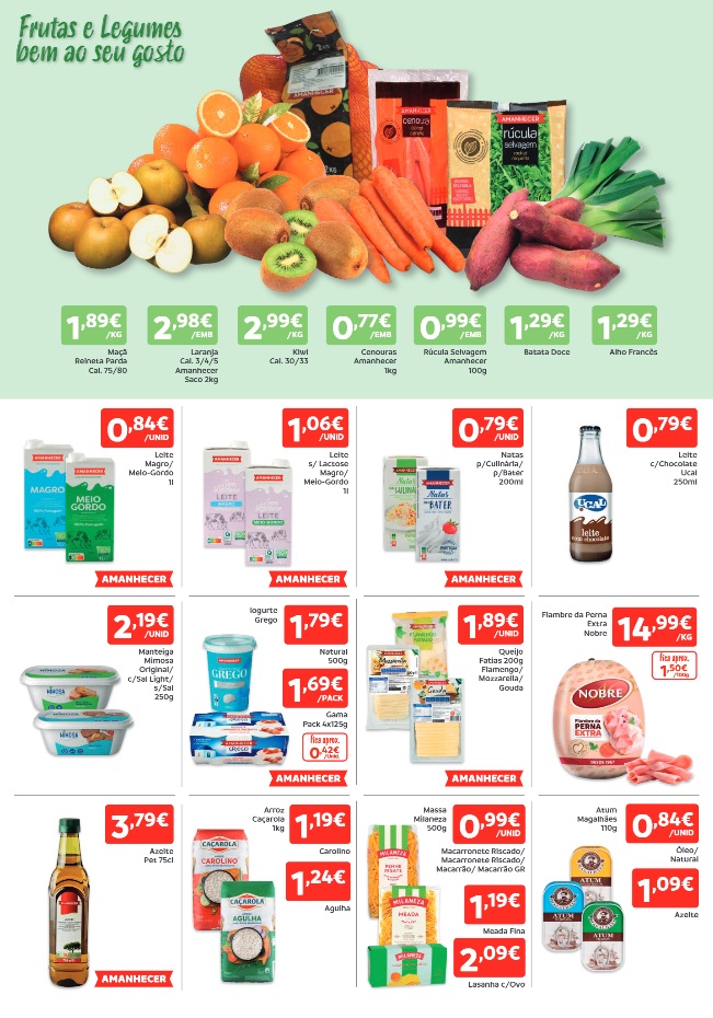 Leite magro / meio gordo Amanhecer a 0,84€ unidade e mais,