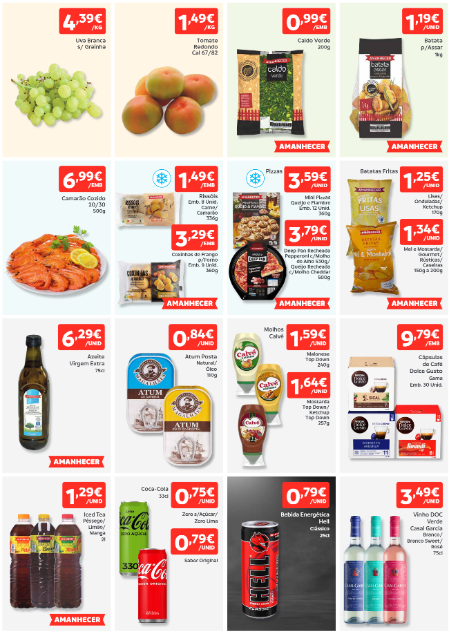 Preços da semana especial Fim de Ano. Todas as promoções e descontos nestes supermercados de proximidade para comparar e poupar. Uva branca sem graínha a 4,39€/kg, azeite virgem AMANHECER a 6,29€/unidade, tomate redondo assinalado a 1,49€/kg, batata para assar AMANHECER a 1,19€/kg e mais para a lista de compras. Aproveitem e Boa semana! Todo o folheto abaixo.??
