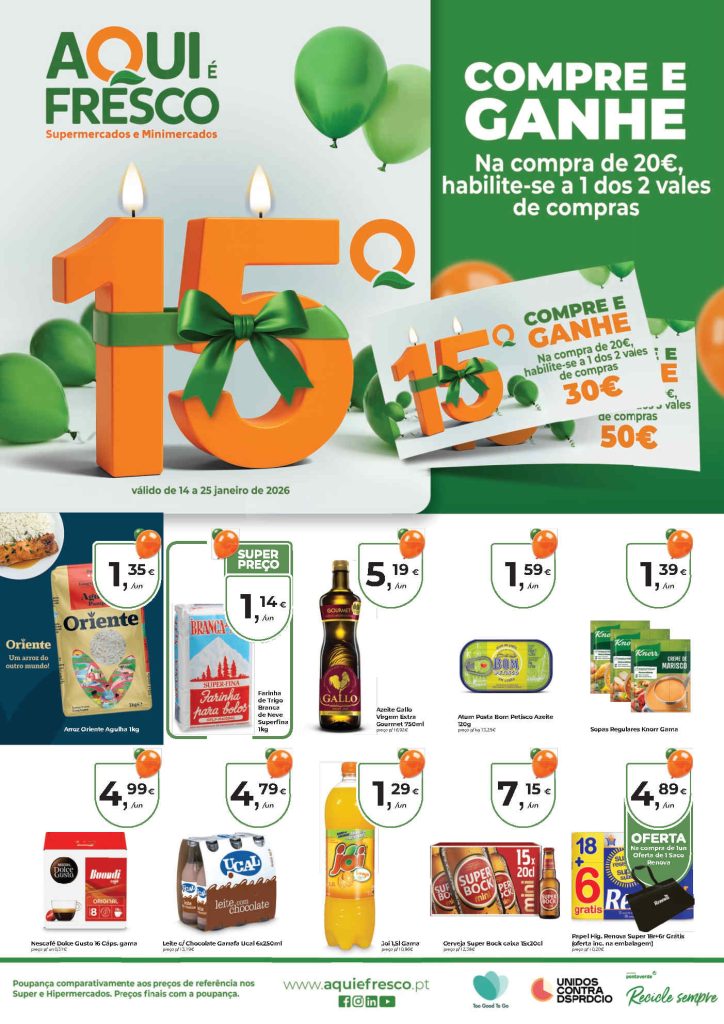 As páginas incluem destaque para produtos frescos com preço mais baixo. Folheto Aqui É Fresco 14 a 25 de janeiro,