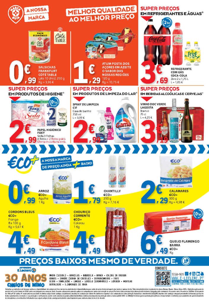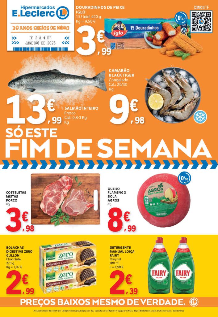 A seleção tem vários produtos úteis para abastecer a despensa com menor custo. Folheto E Leclerc Fim de Semana 2 a 4 de janeiro,