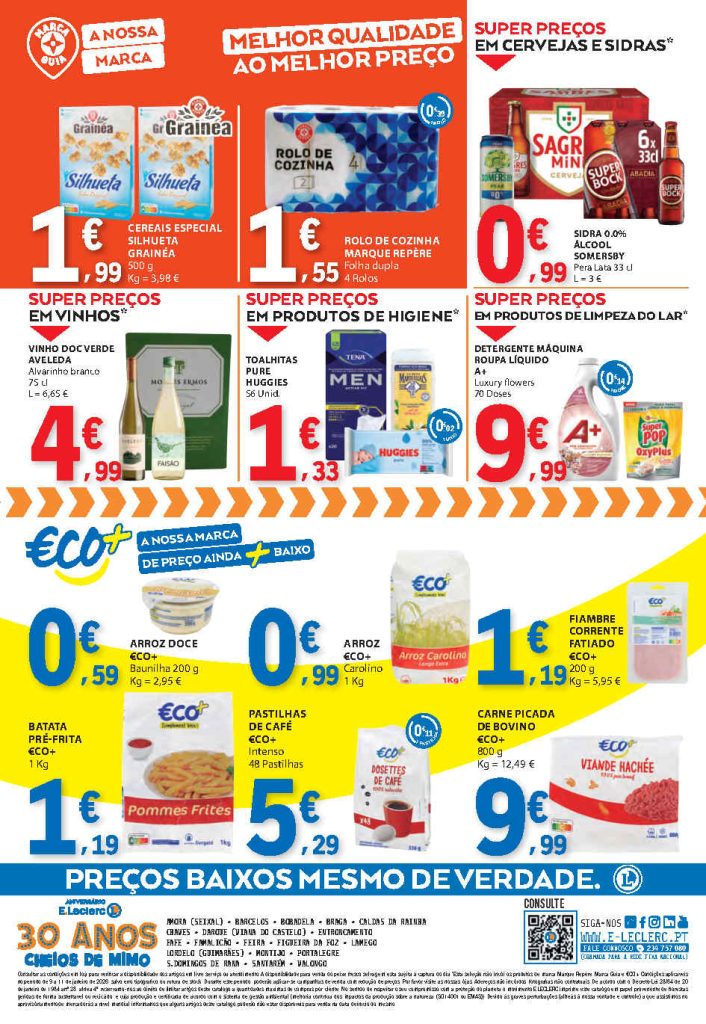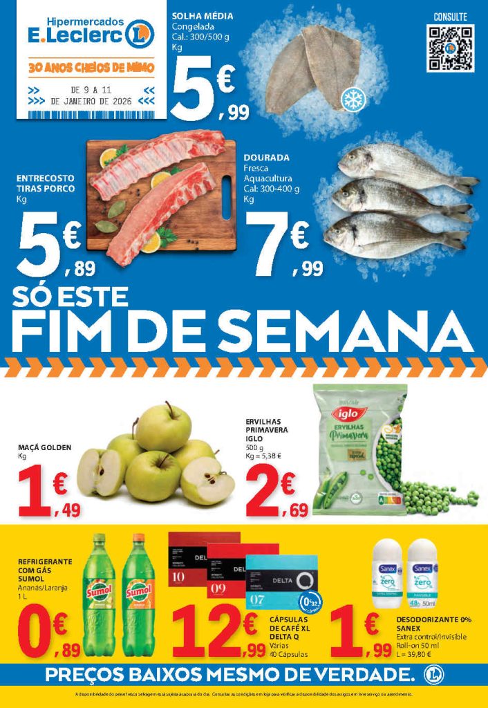 A seleção tem vários produtos úteis para abastecer a despensa com menor custo. Folheto E Leclerc Fim de Semana 9 a 11 de janeiro,