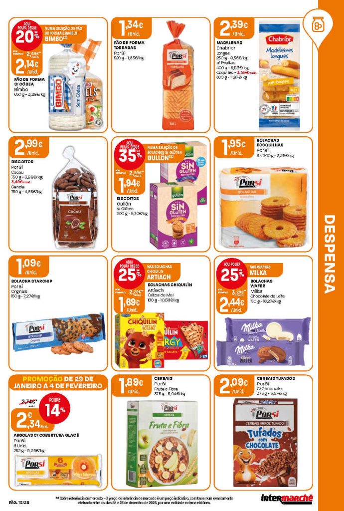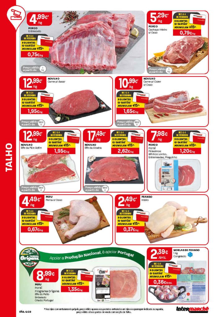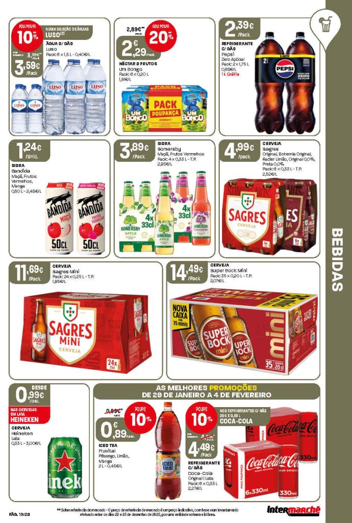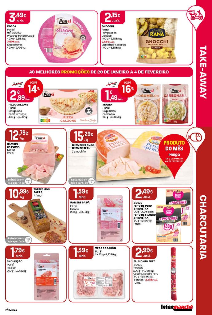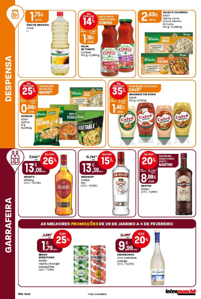 Há cortes interessantes em produtos de mercearia, carnes e bebidas. Folheto Intermarché Lojas Contact 29 janeiro a 4 fevereiro,
