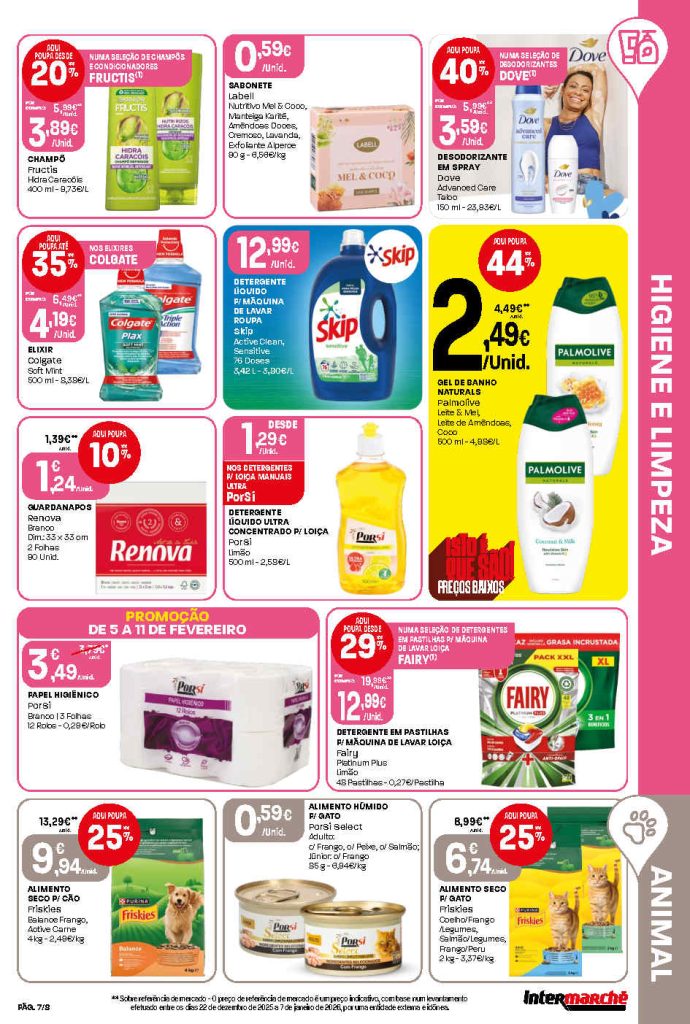Destacam-se reduções em frescos, congelados e higiene pessoal. Folheto Intermarché Lojas Pequenas 5 a 11 de fevereiro,