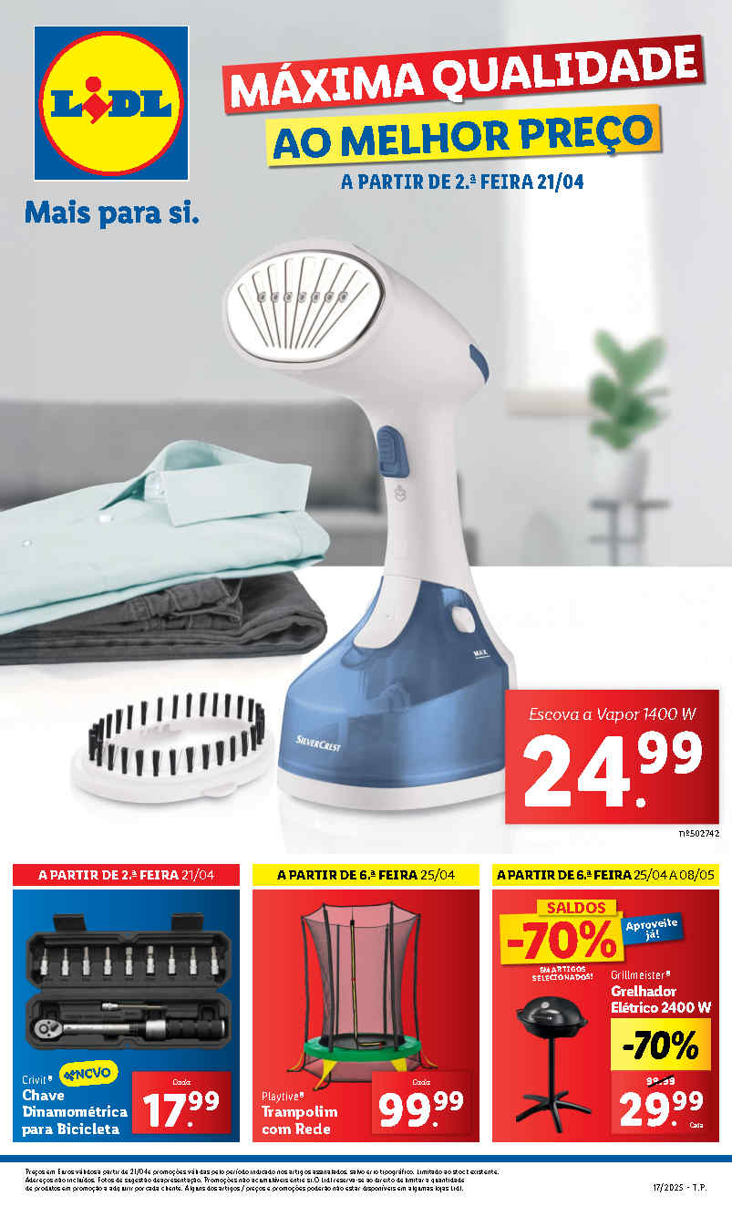 Folheto LIDL Bazar Promoções a partir 21 de abril. Toda a antevisão promoções e descontos diretos e com a app LIDL PLUS no folheto LIDL bazar. Todas as categorias limpeza, casa, moda, arrumação, flores, jardim, cozinha e mais desde chave dinamométrica CRIVIT a 17,99€/unidade, escova a vapor 1400W SILVERCREST a 24,99€/cada, trampolim com rede PLAYTIVE … Continue a ler Folheto LIDL Bazar Promoções a partir 21 de abril