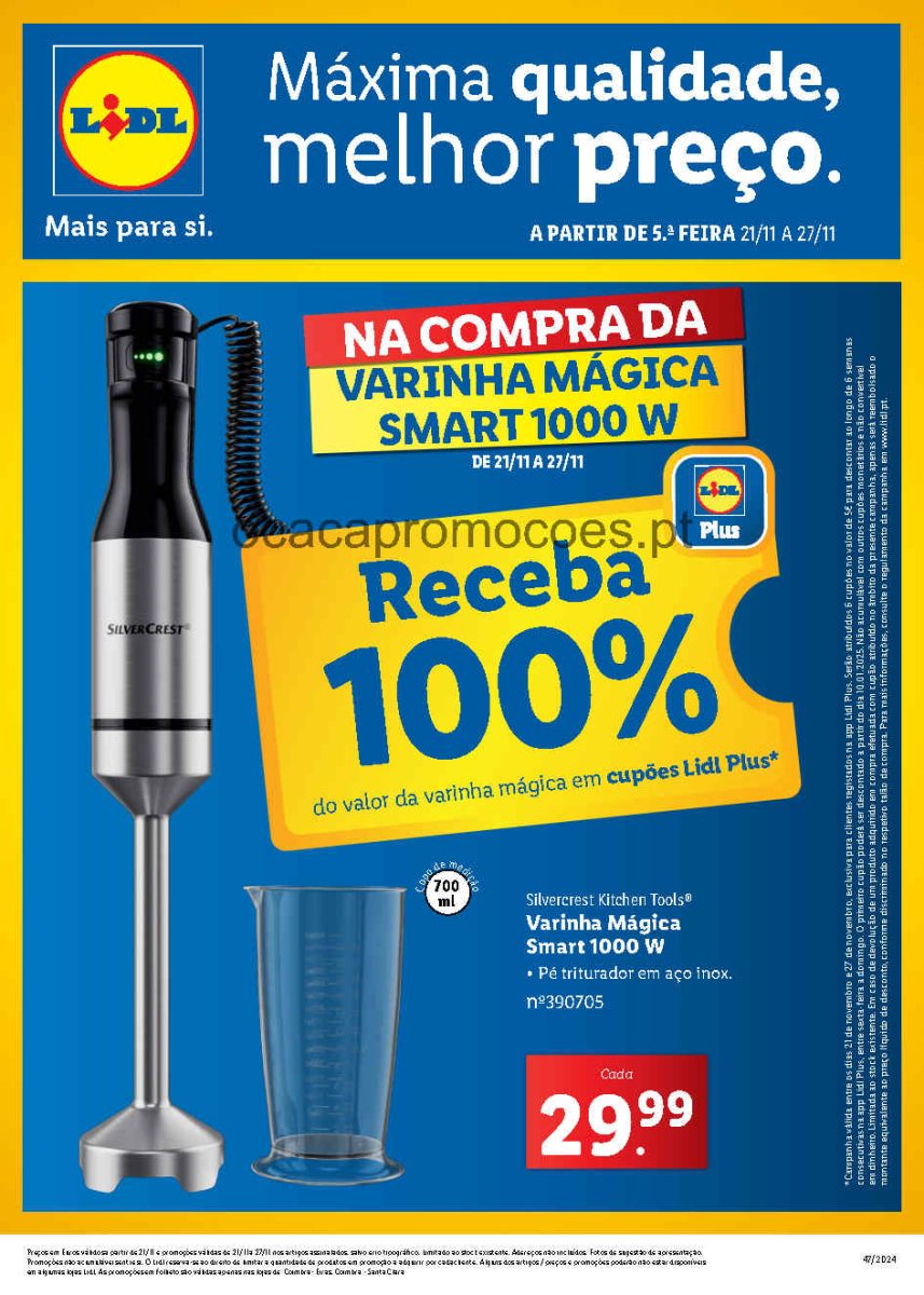 Só nas lojas de Coimbra – Sta Clara e Coimbra – Eiras. As promoções de supermercado neste folheto temático. 100% desconto na varinha mágica smart 1000 W SILVERCREST KITCHRN TOOLS a 29,99€ cada, 20% desconto em todos os iogurtes líquidos MILBONA, noz nacional com casca a 3,19€/kg, 20% desconto em todos os detergentes FORMIL para a roupa, óleo de argão CIEN a 2,59€ e mais. Façam a vossa lista. Usem a app LIDL PLUS. Boas Poupanças! Aproveitem!?Todo o folheto abaixo.??