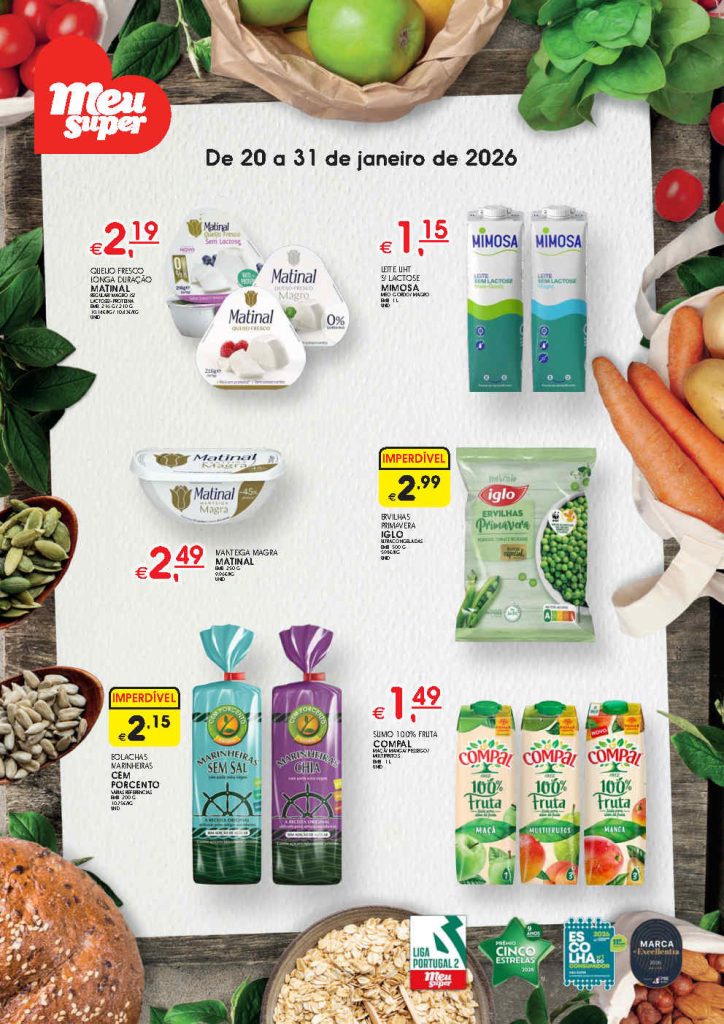 As novidades incluem descidas consistentes em carne, peixe, mercearia e bebidas. Folheto Meu Super 20 a 31 de janeiro,