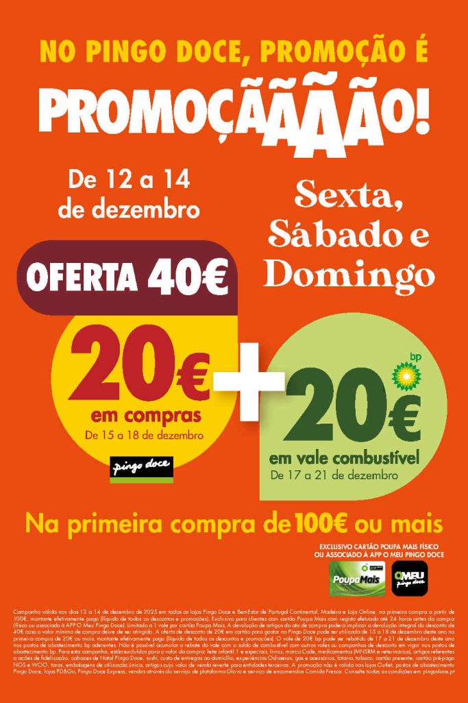 Volta a oferta 20 € + 20€ para usar nas datas indicadas 12 a 14 dezembro. Multiplicam assim as oportunidades em supermercado e combustível⛽. A Oferta de 40€ na primeira compra de 100€ ou mais. Assim 20€ em compras e 20€ em vale combustível BP para usar em datas posteriores. Exclusivo para quem usa cartão Poupa Mais ou a app My Pingo Doce. Consultem os Folhetos. A Antevisão!🎯