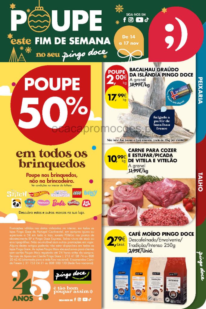 Promoções e descontos fim de semana em alimentar, bazar já em antevisão neste folheto. As ofertas Pingo Doce estão sempre aqui no O Caça Promoções, atualizado permanentemente com todas as noticias para poupar. Aproveite 50% em todos os brinquedos. Consultem os Folhetos. A Antevisão Folheto!🛒