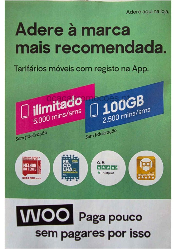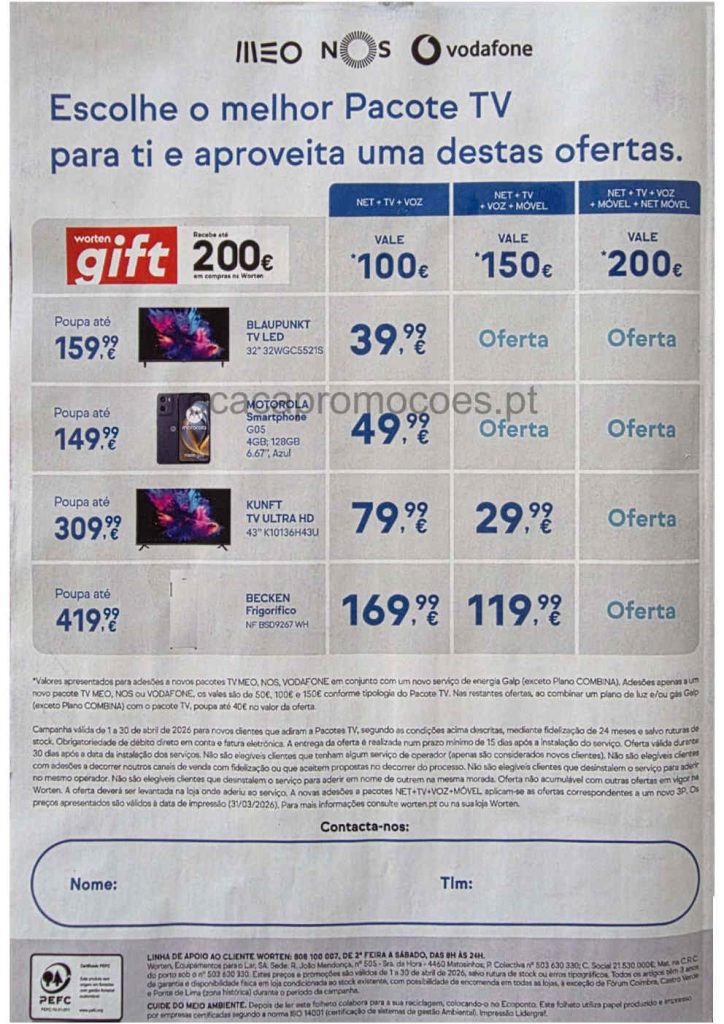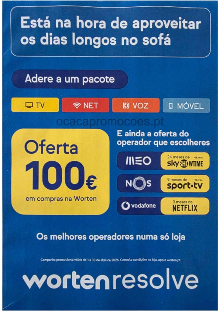 O folheto mensal para comparar. Promoções e ofertas todo o mês de abril. As ofertas e promoções WTF, MEO, Vodafone, Nos, Combina, Yorn e os tarifários. Os tarifários, pacotes fibra, ofertas e mais. A Worten oferece 100,00€ em compras e subscrições ao aderir ao pacote. Consultem os Folhetos. A Antevisão Folheto!