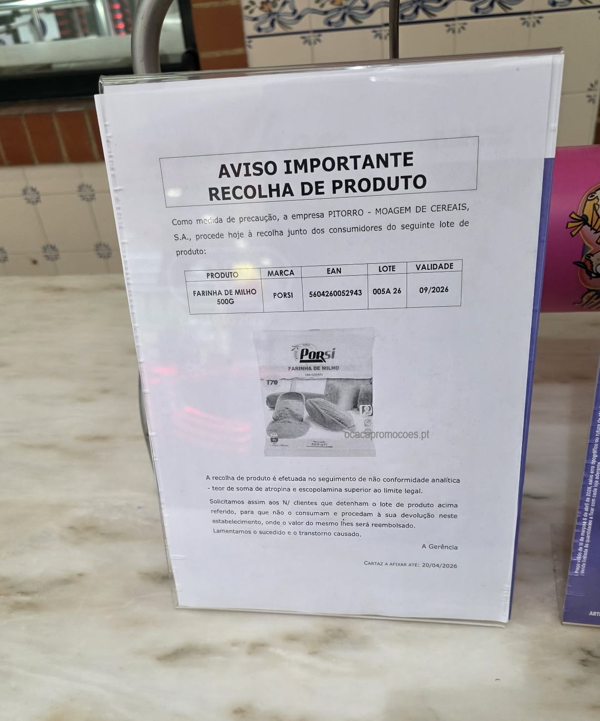 Foi emitido um aviso importante de recolha de produto numa loja Intermarché, referente à farinha de milho da marca Porsi. (Foto que tirei em loja). A medida surge por precaução, após deteção de uma não conformidade que pode representar risco para os consumidores. Produto afetado: Produto: Farinha de Milho 500g Marca: Porsi EAN: 5604260052943 Lote: 005A … Continue a ler Intermarché recolhe farinha de milho Porsi — veja se tem este lote em casa