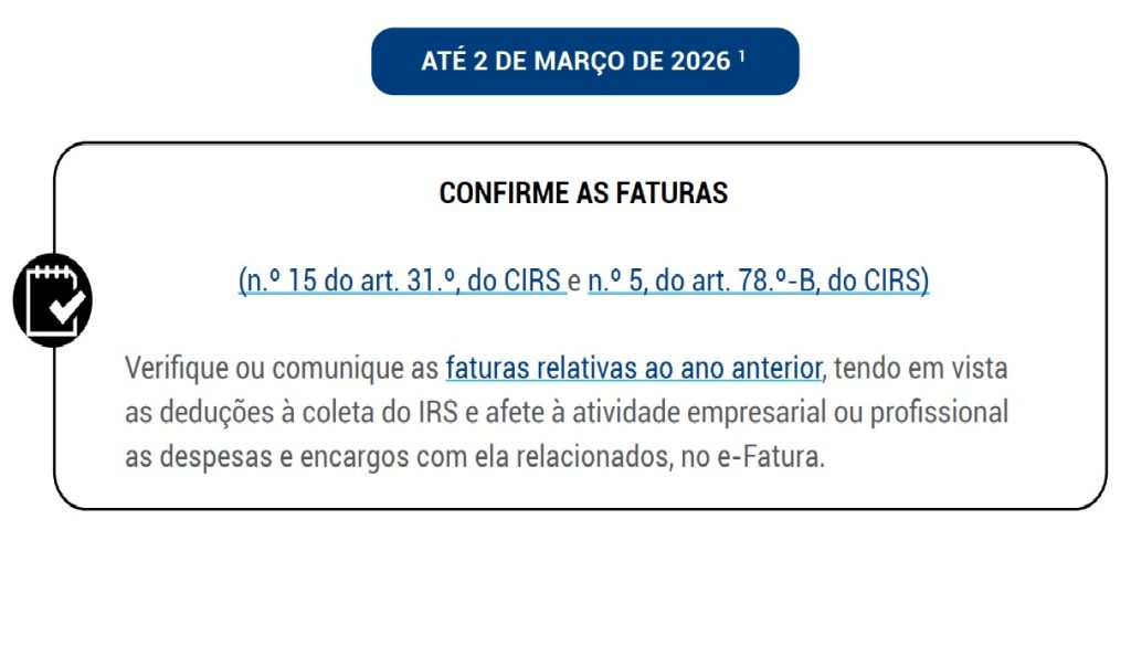 (n.º 15 do art. 31.º, do CIRS e n.º 5, do art. 78.º-B, do CIRS) Verifique ou comunique as faturas relativas ao ano anterior, tendo em vista as deduções à coleta do IRS e afete à atividade empresarial ou profissional as despesas e encargos com ela relacionados, no e-Fatura.