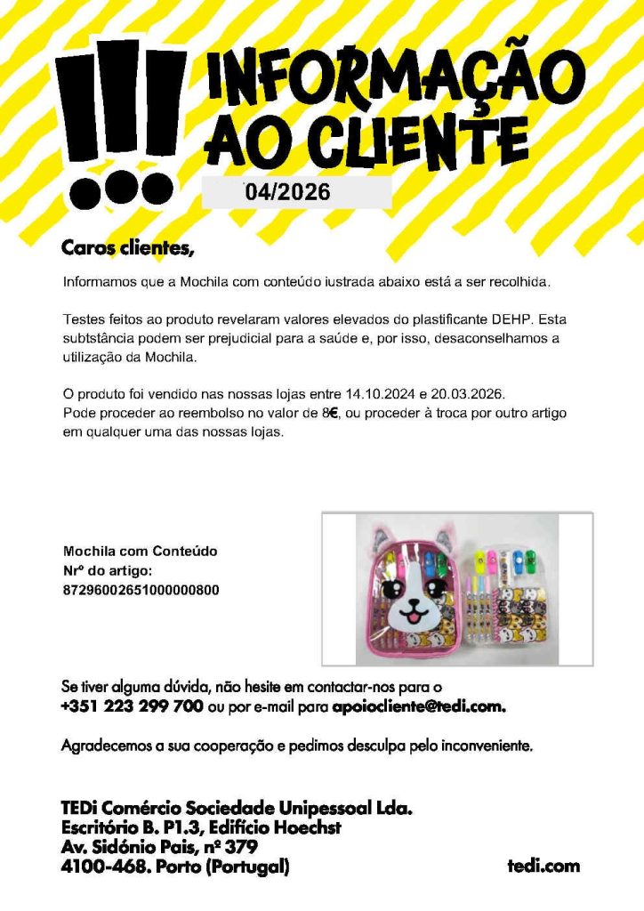 Esta substância pode ser prejudicial para a saúde e, por isso, desaconselhamos a utilização da Mochila. O produto foi vendido nas nossas lojas entre 14.10.2024 e 20.03.2026.