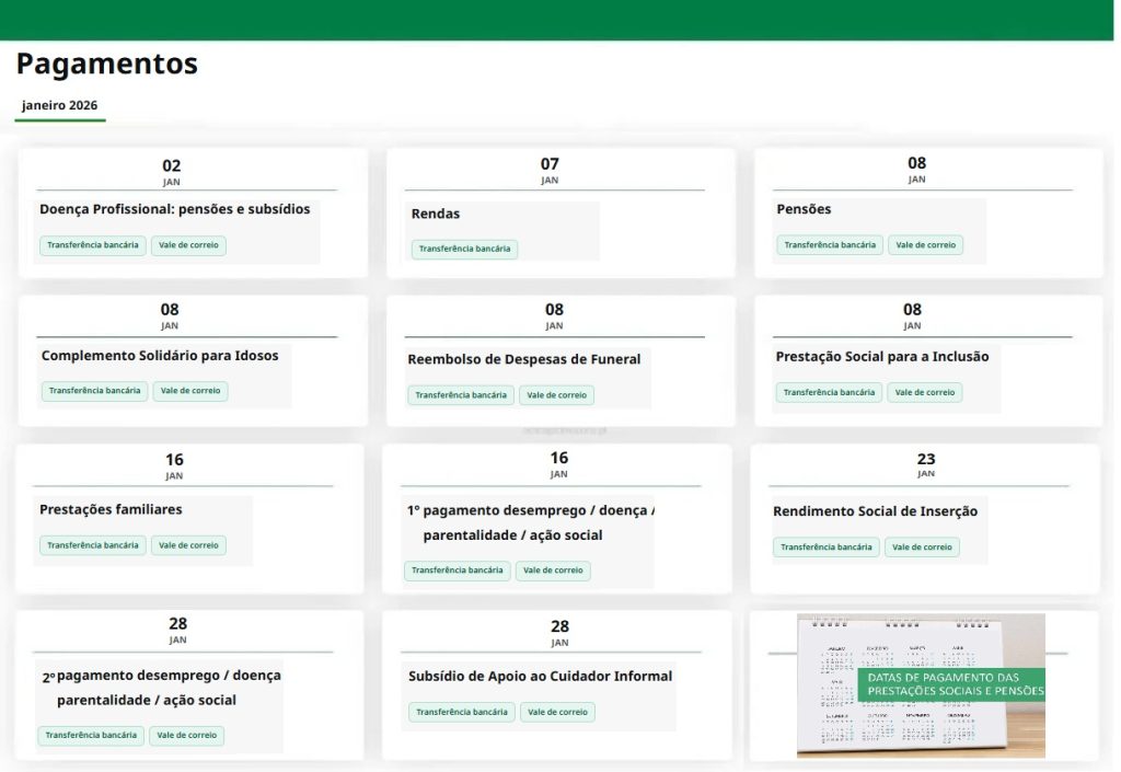 Doença profissional – Pensões e subsídios, Complemento solidário para idosos, Rendas, Pensões, Prestação social para a inclusão, Reembolso de despesas de funeral, 1º pagamento Desemprego, 1º pagamento Doença, 1º pagamento Parentalidade, 1º pagamento Ação Social, Prestações Familiares ( Abono de Família ), Complemento Regional de Pensão, rendimento social de inserção, 2º pagamento Desemprego, 2º pagamento Doença, 2º pagamento Parentalidade, 2º pagamento Ação Social, Subsídio de Apoio ao Cuidador Informal.