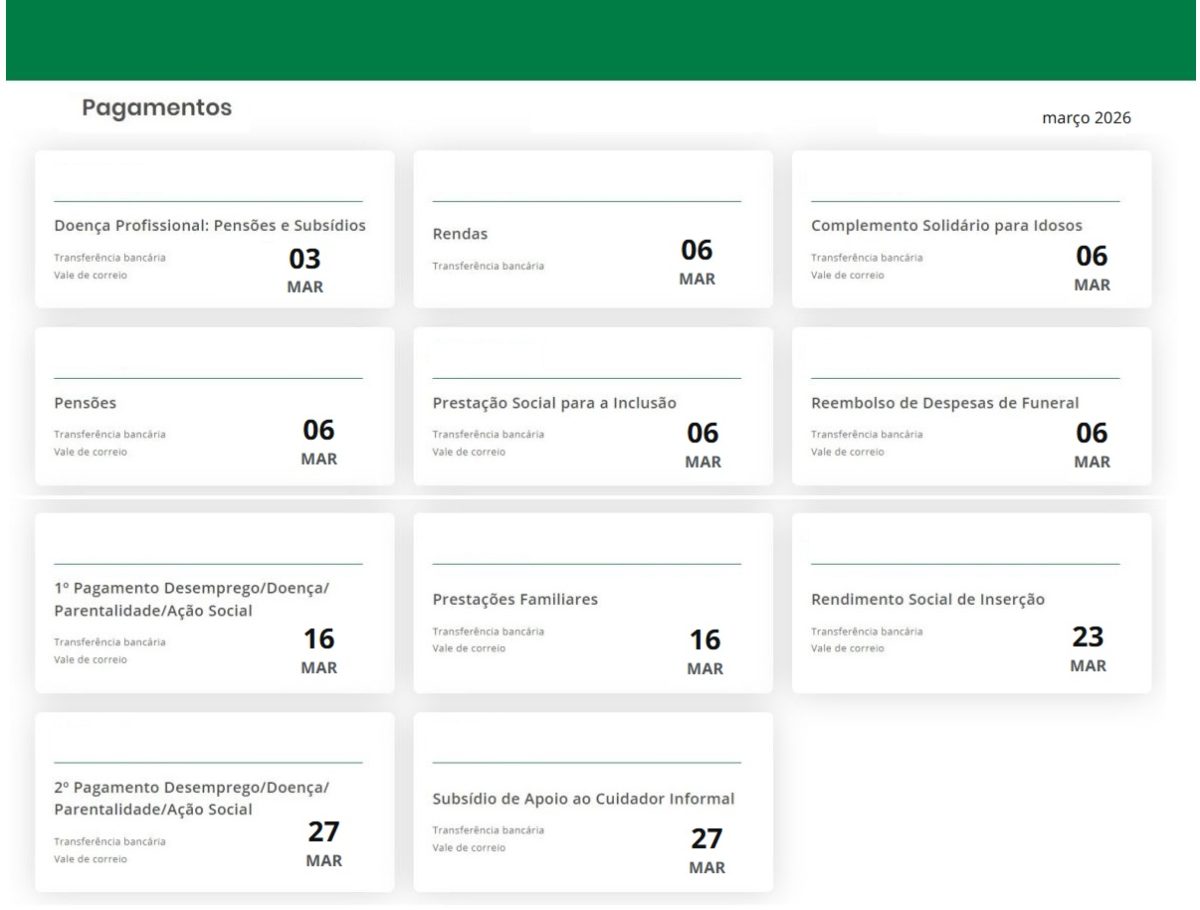 A informação Segurança Social sobre pensões, subsídios, prestações sociais, pagos através de transferência bancária ou vale de correio.📅 Consulte ainda mais artigos Segurança Social aqui no site O Caça Promoções. A informação é diariamente atualizada.📅 No mês de março os seguintes subsídios são pagos; Benefícios Doença profissional – Pensões e subsídios, Complemento solidário para … Continue a ler Recebe Subsídios ou Pensões? Estas são as datas de pagamento apoios em março