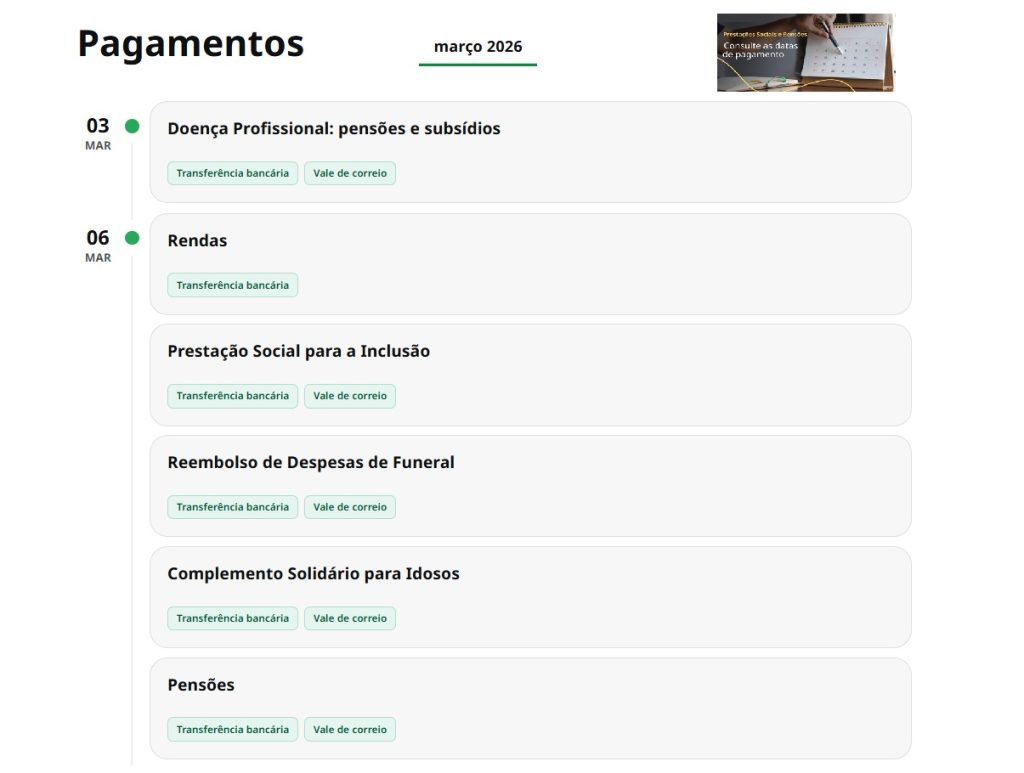 Antevisão.📅 Fique a saber o dia de pagamento Segurança Social no mês de março 2026, Toda a informação em pensões, subsídios, prestações sociais e mais, pagos através de transferência bancária ou vale de correio.📅 Tomem nota das informações, direitos e deveres. Os pagamentos serão nas datas abaixo mencionadas; Consulte ainda mais artigos Segurança Social aqui no site O … Continue a ler Subsídios e Pensões em março – Datas pagamento Segurança Social