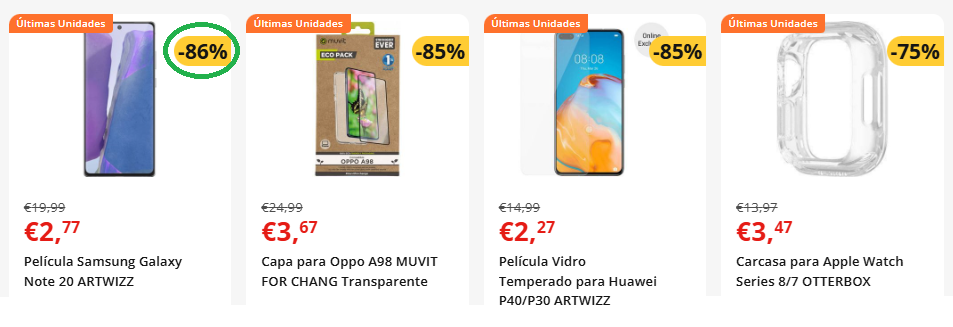 Novidades Black Friday. Três artigos em exemplo (mas existem artigos com mais desconto até 86% ) na oferta Leva 3 Paga 2 em acessórios de Smartphone até 100€.